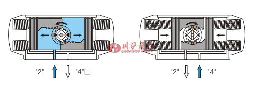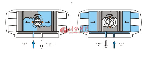 當氣源壓力從氣口(2)進入氣缸兩活塞之間中腔時,使兩活塞分離向氣缸兩端方向移動,兩端氣腔的空氣通過氣口(4)排除, 同時使兩活塞齒條同步帶動輸出軸(齒輪)逆時針方向旋轉(zhuǎn)。反之氣源壓力從氣口(4)進入氣缸兩端氣腔時,使兩活塞向 氣缸中間方向移動,中間氣腔的空氣通過氣口(2)排除,同時使兩活塞齒條同步帶動輸出軸(齒輪)順時針方向旋轉(zhuǎn)。 (如果把活塞相對反方向安裝,輸出軸變?yōu)榉聪蛐D(zhuǎn),即為雙作用反轉(zhuǎn)型)